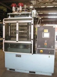 MODEL #5100R2424S-5CCS-R-Y(2)-58. SERIAL #03-03-001. CURRENTLY SET UP WITH FIVE 24.5” X 24.5” X 2” PLATENS THAT WERE BEING STEAM-HEATED AND WATER-COOLED. MAX OPERATING TEMP IS APPROX 350 F. FOUR DAYLIGHT OPENINGS OF APPROX 3” EACH; WITH JUST TWO PLATENS INSTALLED THE DAYLIGHT WOULD BE APPROX 18”. CLAMP CYLINDER IS: 9” BORE; SINGLE-ACTING WITH APPROX 12” STROKE. CLEARANCE BETWEEN POSTS IS 27.75” L TO R X 18.5” F TO B. NOMINAL BED SIZE OF 27.75” X 24.5”. FULLY GUIDED ON 2.5” DIAMETER TIE RODS WITH 6” BUSHINGS. OPERATOR HEIGHT IS APPROX 50” (WITH PLATEN). FORK POCKETS. FULLY GUARDED. SELF-CONTAINED HYDRAULIC SYSTEM: 3 HP MOTOR (1200 RPM; 460 VOLT); 1 HP MOTOR (1800 RPM; 460 VOLT); APPROX 20 GALLON RESERVOIR; ADJUSTABLE PRESSURE; ETC… ELECTRICAL CONTROLS INCLUDE: ALLEN-BRADLEY SLC 500 PLC; RED LION OPERATOR INTERFACE VX500; 2 CLOSE BUTTONS; OPEN; RESET; E-STOP; INTERLOCK ON FRONT DOOR; ETC… 175 PSIG STEAM FOR PLATEN HEATING. 45 GPM WATER AND 50 SCFM AIR FOR OPTIONAL COOLING. OVERALL DIMENSIONS APPROX 73” X 68” X 102” TALL. APPROX 10,000 POUNDS. SOME PRINTS.